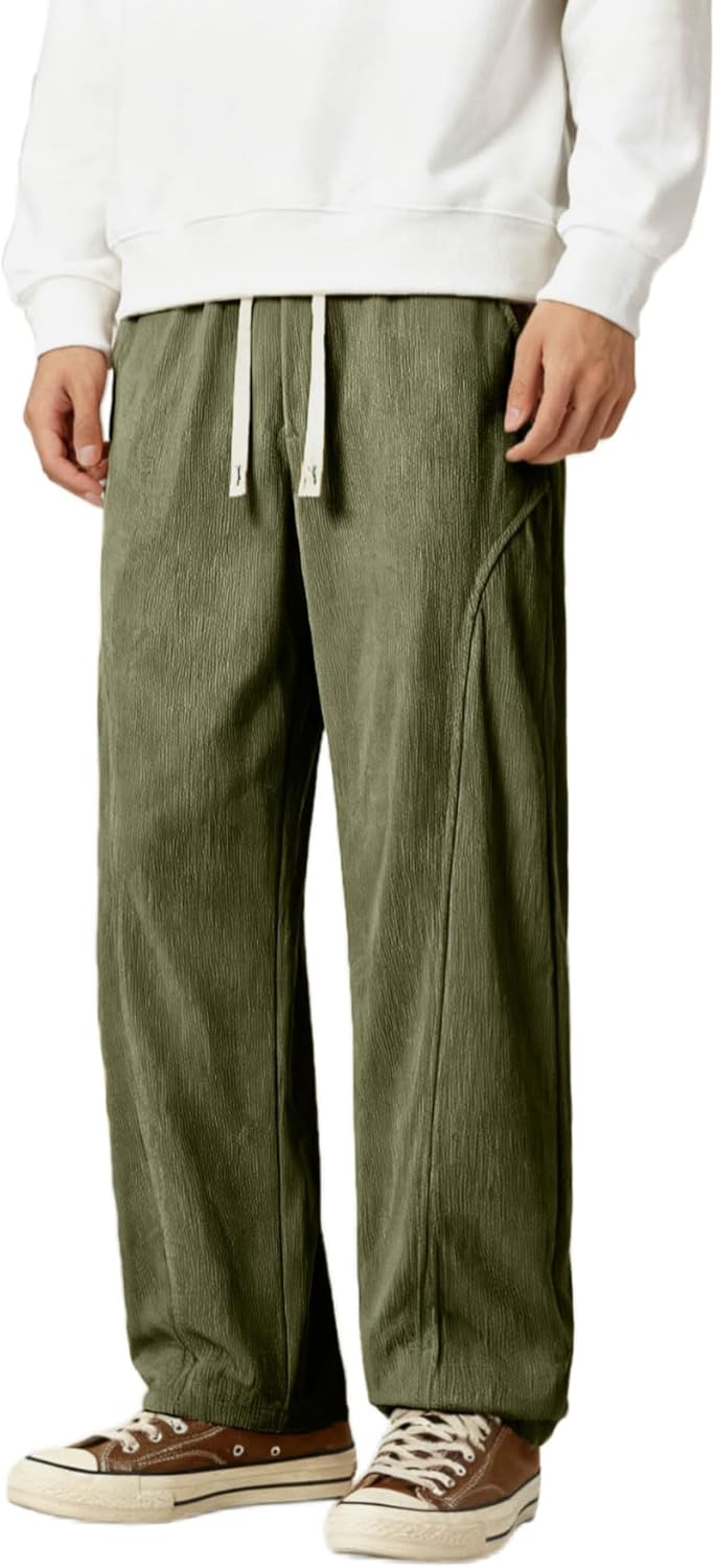 Men's Corduroy Wide Leg Fashion Casual Pants Loose Fit Baggy Straight Sweatpants Elastic Waist Drawstring
