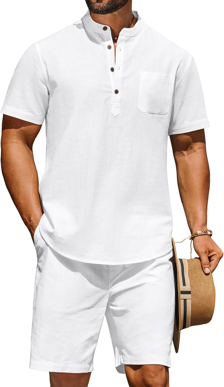 COOFANDY Men's 2 Piece Cotton Linen Sets Summer Beach Outfits Casual Short Sleeve Henley Shirts and Vacation Shorts