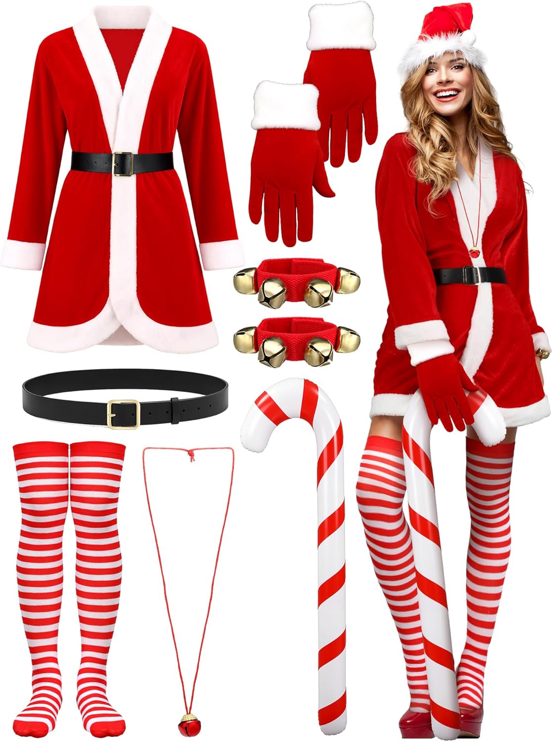 9pcs Women Christmas Santa Claus Costume Mrs Claus Velvet Dress with Belt Striped Knee Socks Hat Gloves Elf Shoes