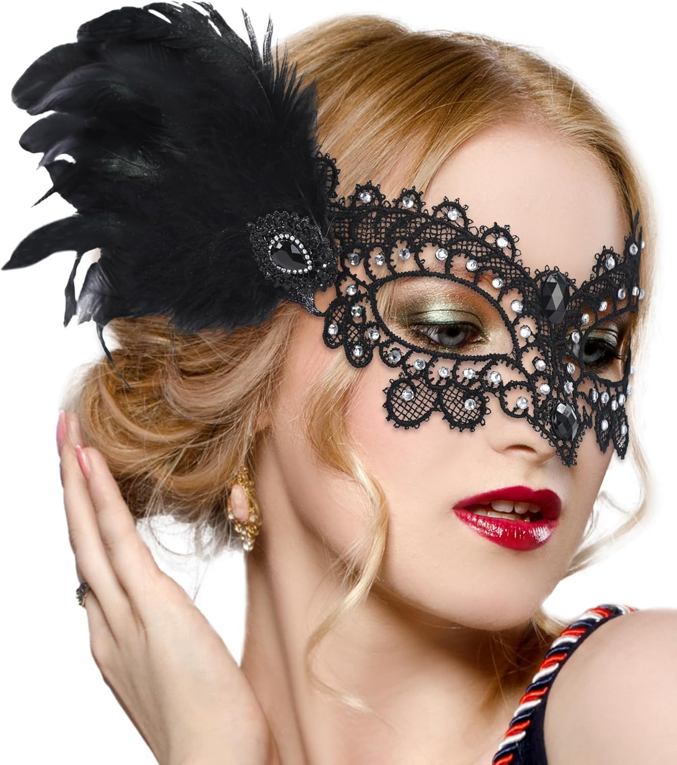 Halloween Feather Masquerade Masks - 1920s 50s Antique Lace Venetian Mask for Women Renaissance Cosplay Party