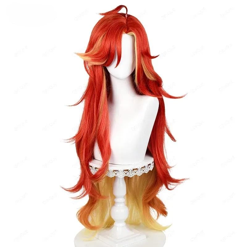Red Yellow Wig for Mavuika Cosplay, Wavy Costume Wig, Synthetic Hair with Bang for Women Halloween Carnival Party