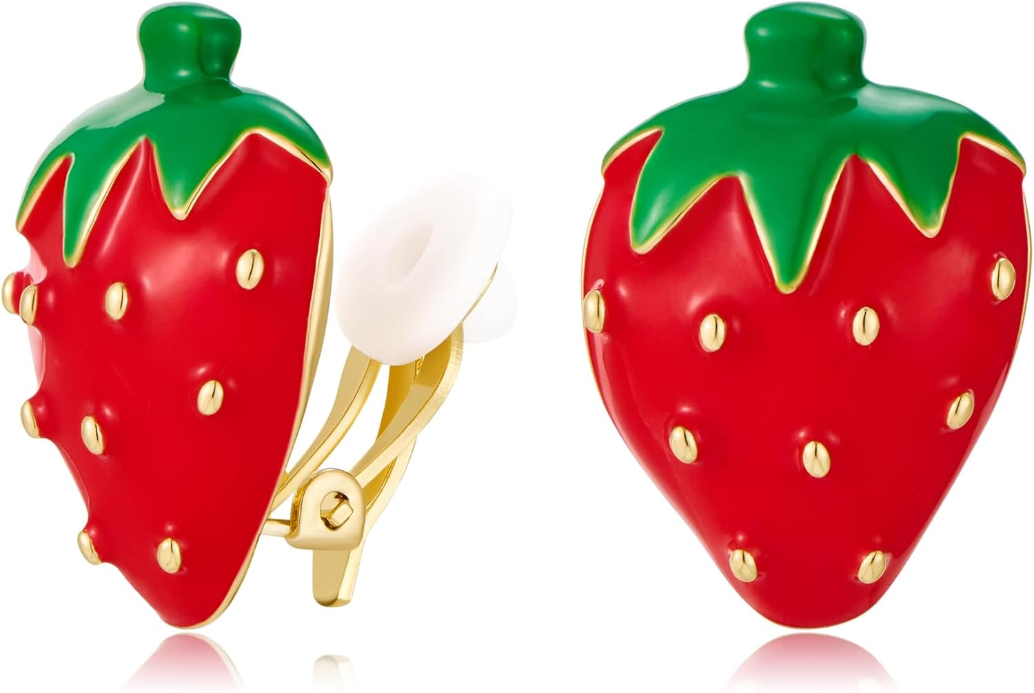 Strawberry Clip On Earrings for Women Red Cute Strawberry Cherry Clip On Earrings Summer Fruit Non Pierced Earring