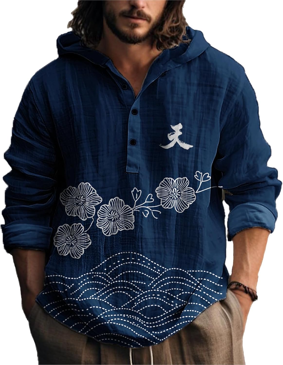MARSVOVO Japanese Style Hooded Shirts for Men Long Sleeve Quarter Button Daily Light Weight Hoodie for Spring Fall