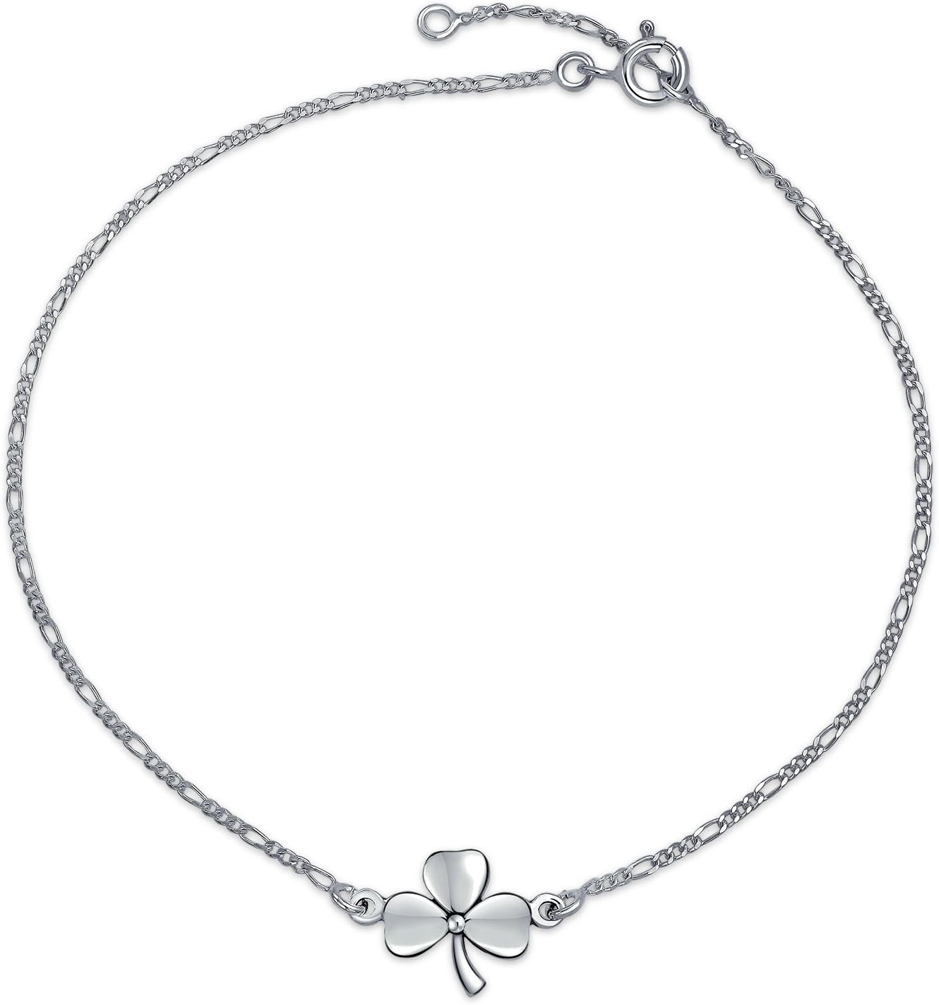 Bling Jewelry Three Four Leaf Shamrock Flower Anklet Lucky Charm Clover Ankle Bracelet For Women Teens Figaro Curb Link Oxidized .925 Sterling Silver 9 To 10 Inch With Extender Adjustable
