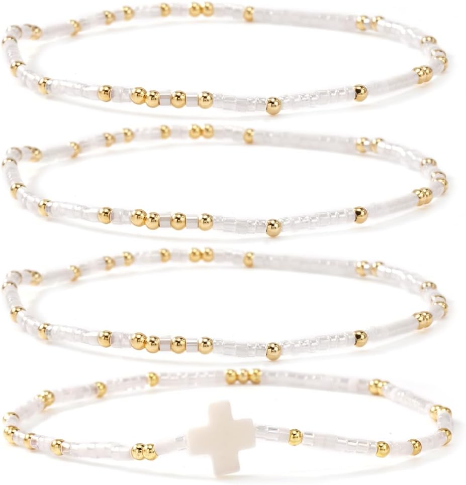 Gold Colorful Beaded Cross Bracelet Stack Set for Women,Handmade Bohemian Seed Beads Stacked Bracelets Fashion Holiday Jewelry Gift