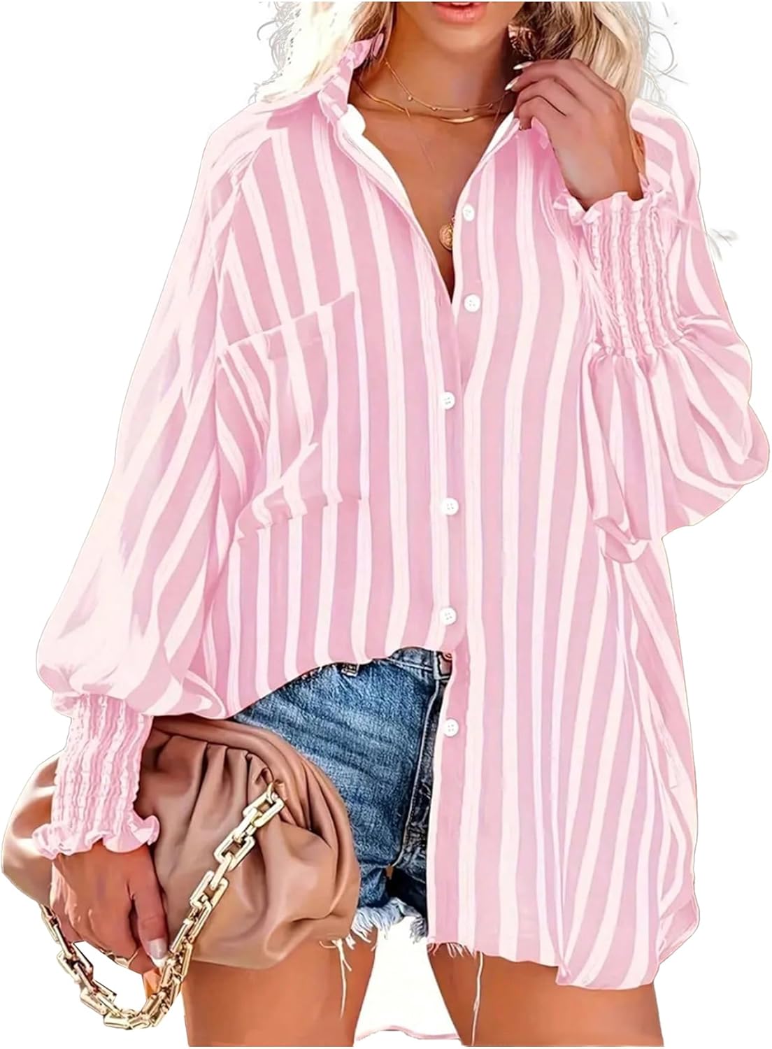 Women's Plus Size Striped Button Down Shirt Long Sleeve Loose Casual Blouse Tops
