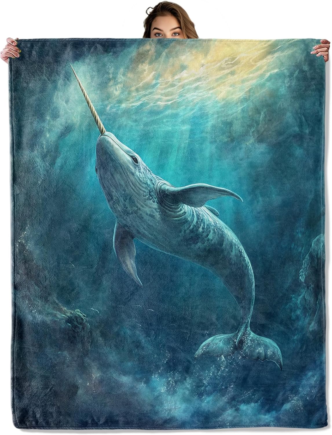 - 【Majestic Narwhal in Ocean】 This blanket showcases a breathtaking image of a narwhal swimming gracefully through deep blue waters, illuminated by sunlight filtering from above. The detailed textures of its long tusk and sleek body emphasize the beauty and mystery of this rare sea creature. With its vibrant aquatic tones, the design brings a sense of wonder and tranquility, making the blanket both a cozy cover and a stunning decorative accent.