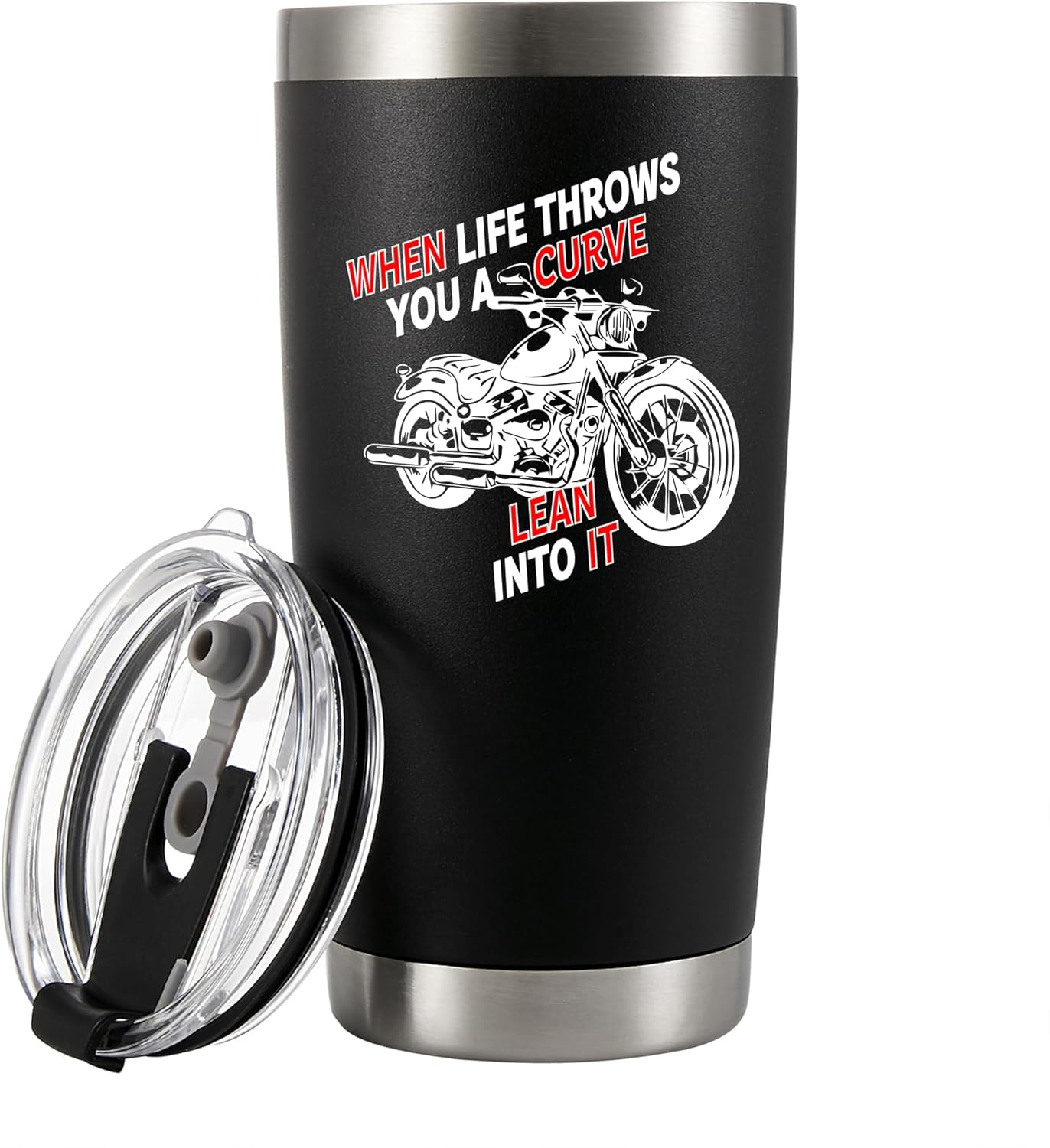 When Life Throws You a Curve Lean Into It Motorcycle Motorcyclist Gift Vacuum Insulated Tumbler Biker Rider For Dad Husband Boyfriend Uncle Stainless Steel Tumbler with Lid and Straw 20 oz Black