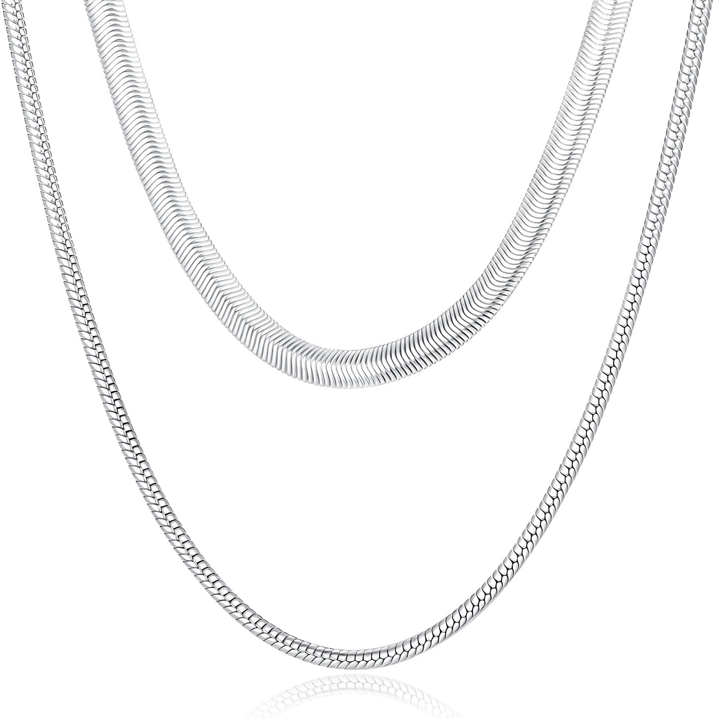 VNOX 2 Pcs Sterling Silver Plated Chain for Men Women Stainless Steel Snake Necklace Flat Herringbone Chains for Men Layering Choker Necklace Stack Jewelry Gift,16+2/18+2/20+2 Inch,Non Tarnish