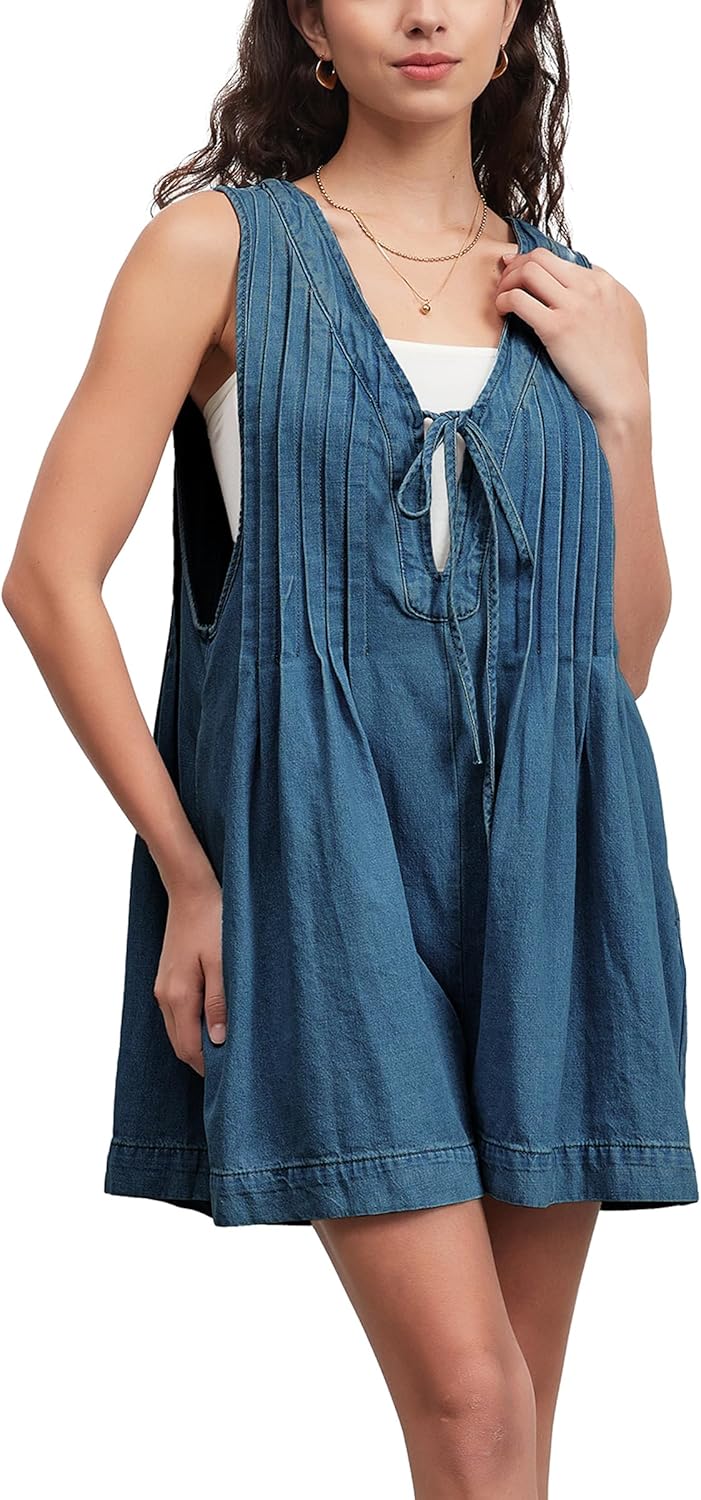 D-Sun Women Summer Sleeveless Denim Romper Casual V Neck Tie Front Ruffled Denim Short Overall Jumpsuit with Pocket