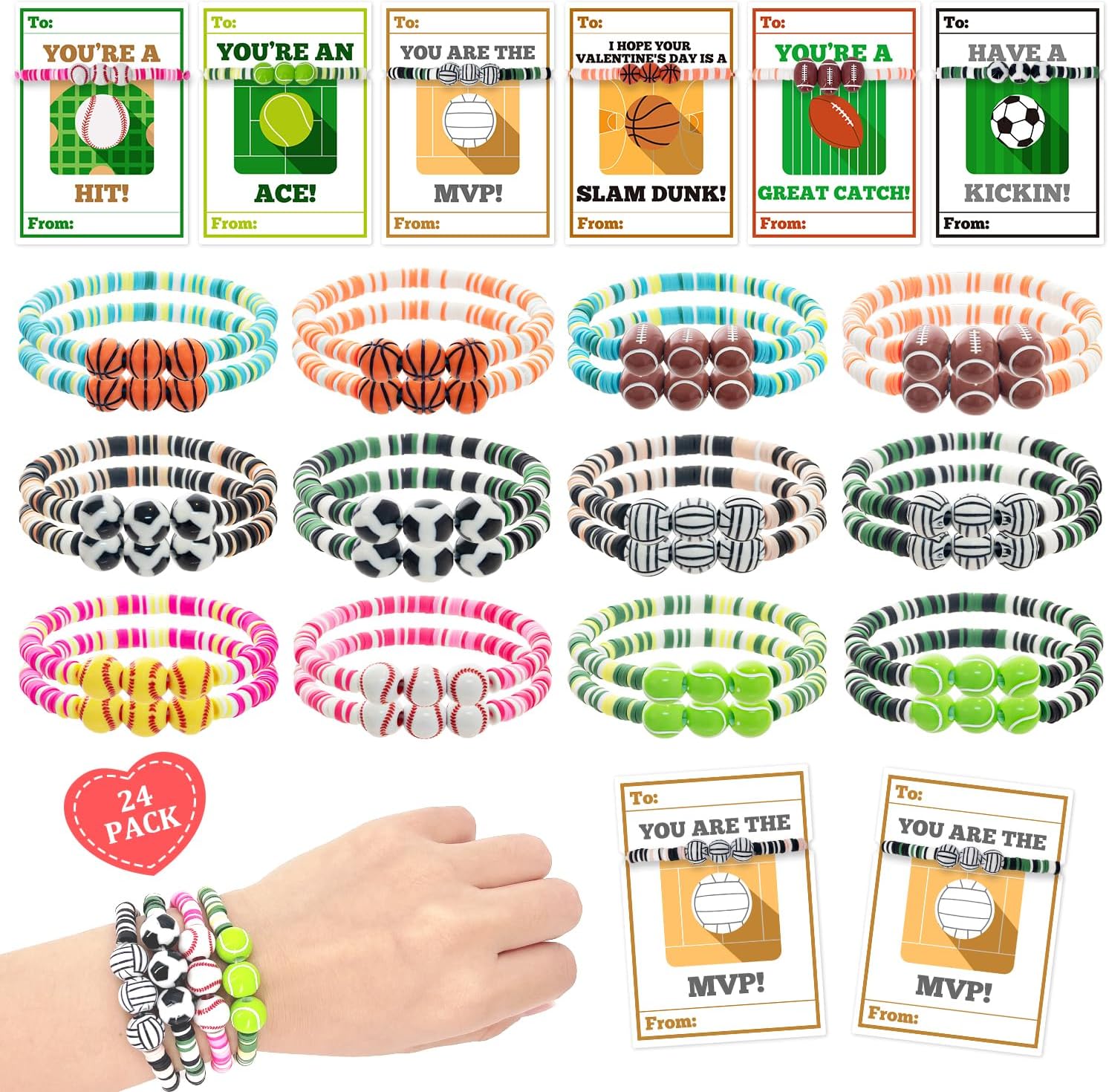 MOVINPE Valentines Day Exchange Gifts for Kids Classroom, 24 Pack Sports Charm Friendship Bracelets with Valentines Day Cards, Classroom Prizes, Valentine’s Day Cards for Kids School Bulk