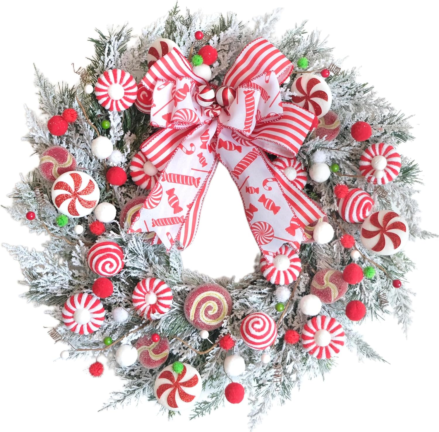 TEMPUS 24 Inch Artificial Frosted Pine Christmas Wreath for Front Door with Pom-Poms, Candy Canes & Bow, Indoor Outdoor Wall Window Home Holiday Decor
