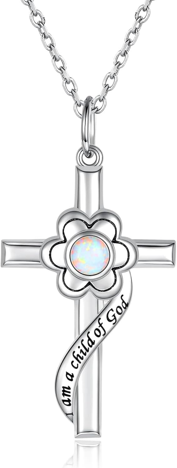 I am a Ch1ld of God Necklace - 925 Sterling Silver Birthstone Flower Cross Pendant Religious Jewelry Baptism First Communion Confirmation Gifts for Young Ones