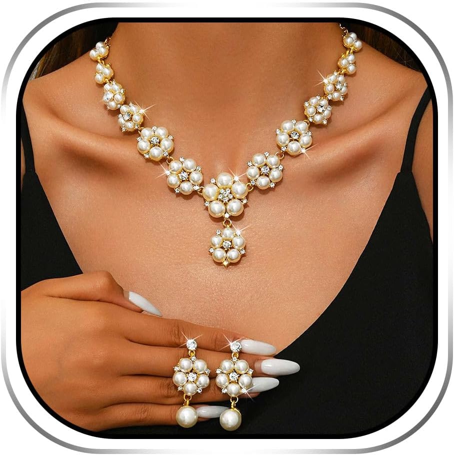 EVILD Pearl Jewelry Sets Gold Flower Necklace and Earring Set for Women