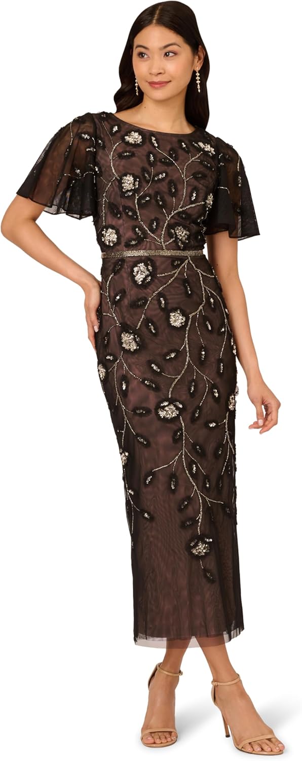 Adrianna Papell Womens Beaded Mesh Column Dress
