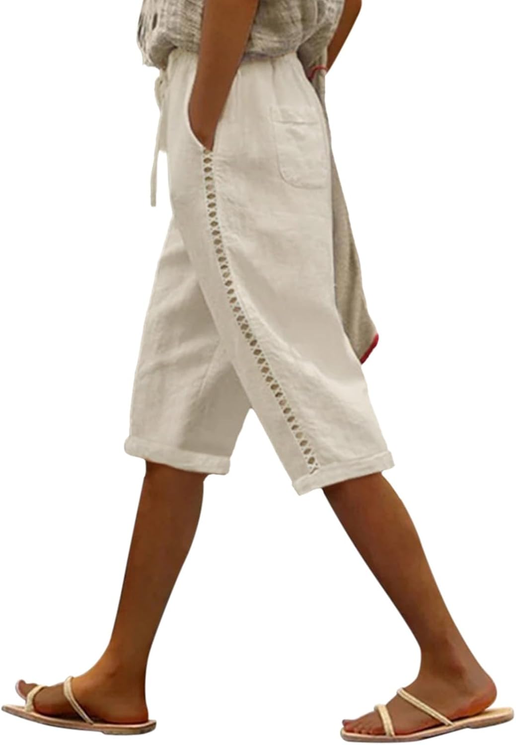 Puimentiua Women Linen Shorts Casual Knee Length Bermuda Shorts with Hollow Side Summer Beach Lightweight Capri Pants