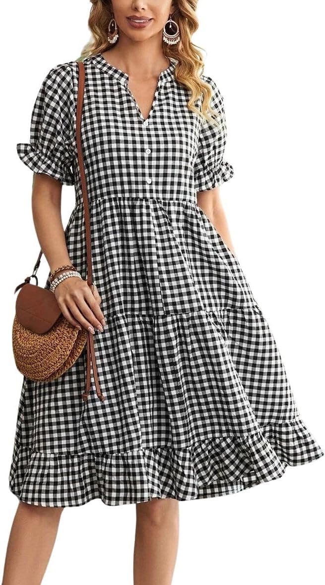 chouyatou Women's Y2k Plaid Babydoll Dress Puff Sleeve Ruffle Hem Short Dress Retro Gingham Swing Midi Dress