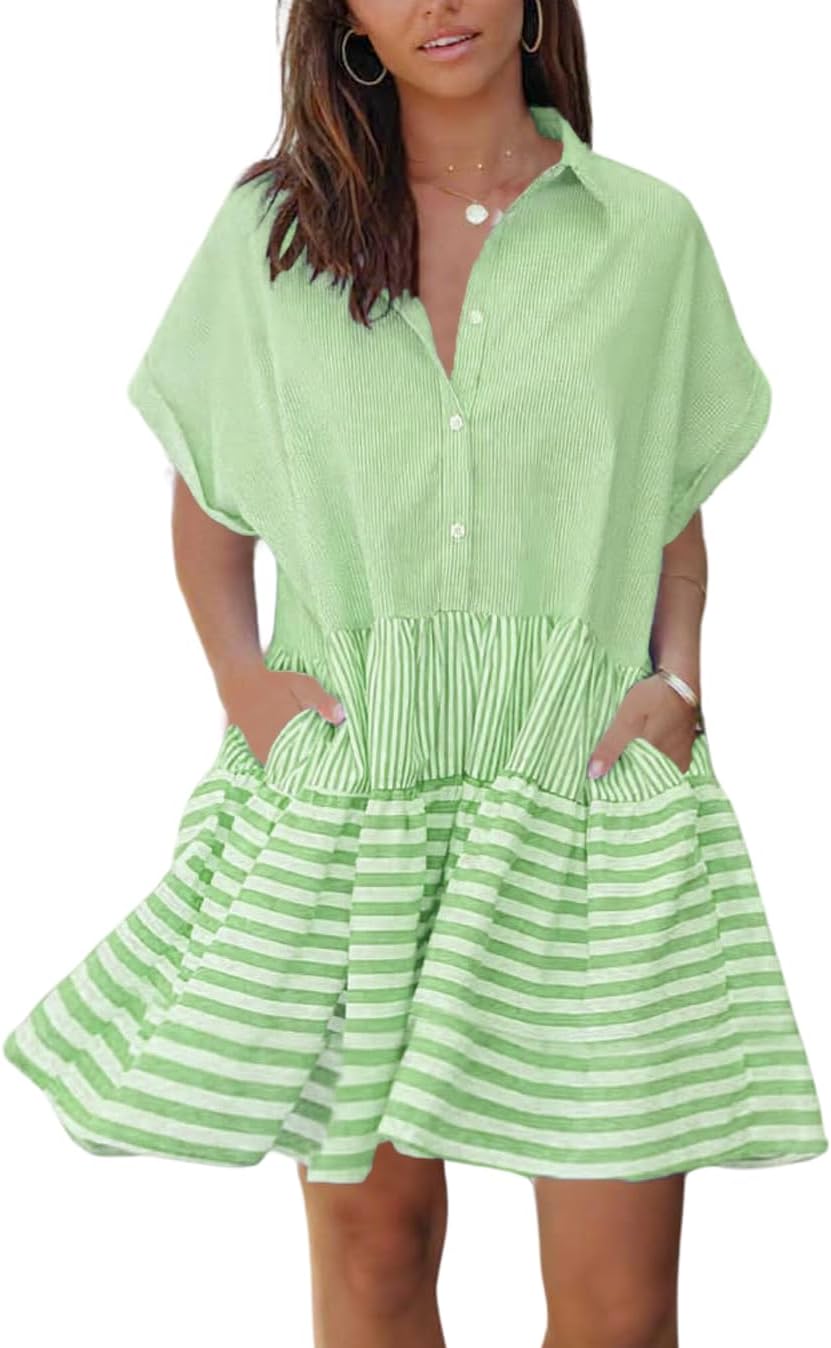 chouyatou Women Summer Beach Short Sleeve Striped Shirt Dress Button Down Tiered Mini Tunic Babydoll Dress
