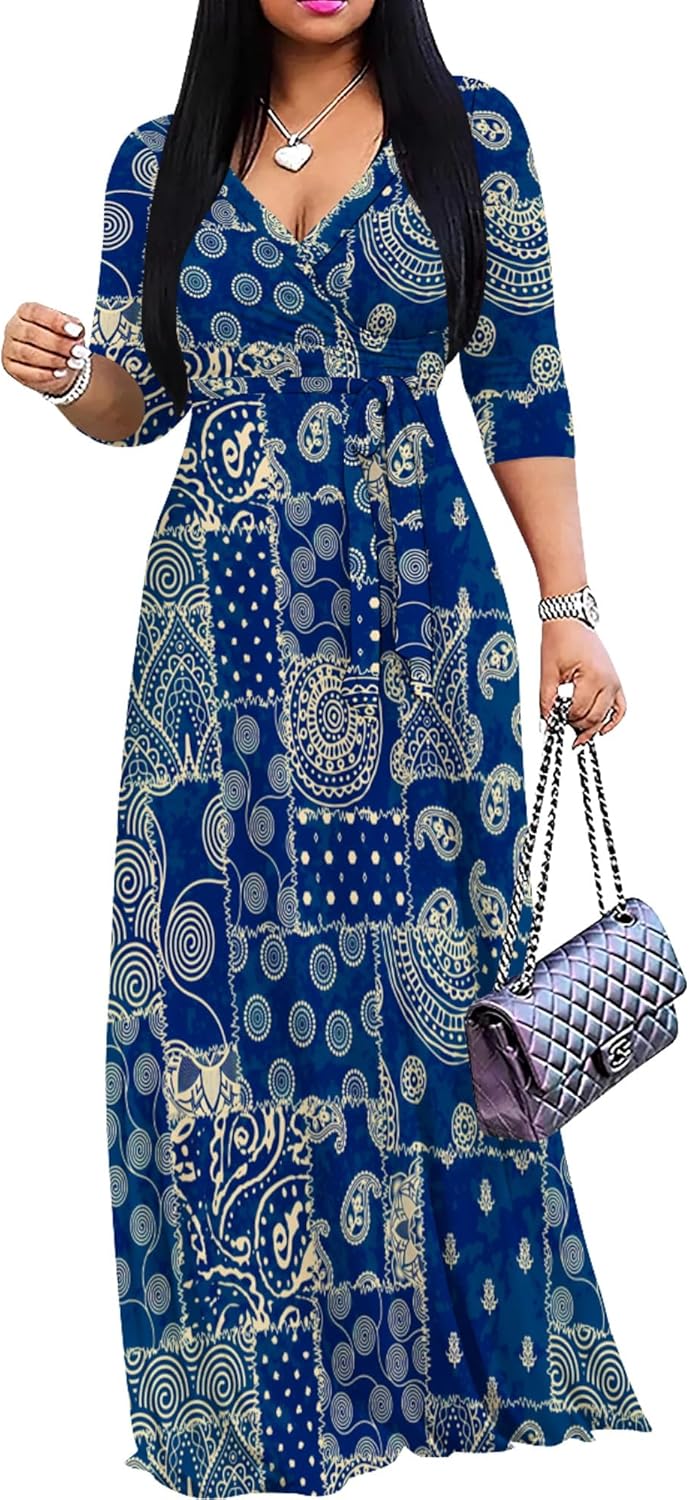 Plus Size Dresses for Women Print Maxi Dresses Flowy 3/4 Sleeve with Belt