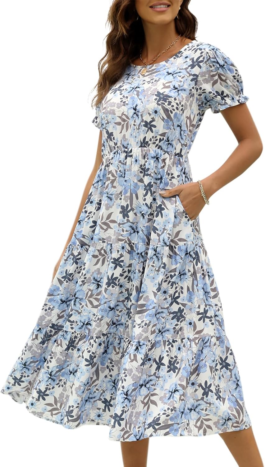 NAVINS Women Floral Print Puff Sleeve Tiered A-Line Swing Midi Dress with Pockets NA1002
