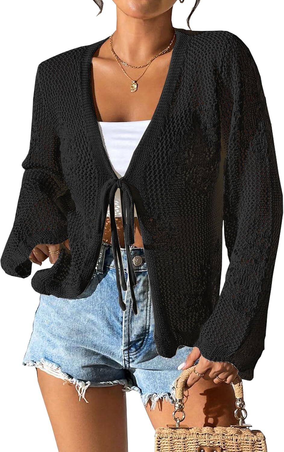 Women Lightweight Tie Front Cardigan Crochet Hollow Out Long Sleeves Summer Knit Cardigans