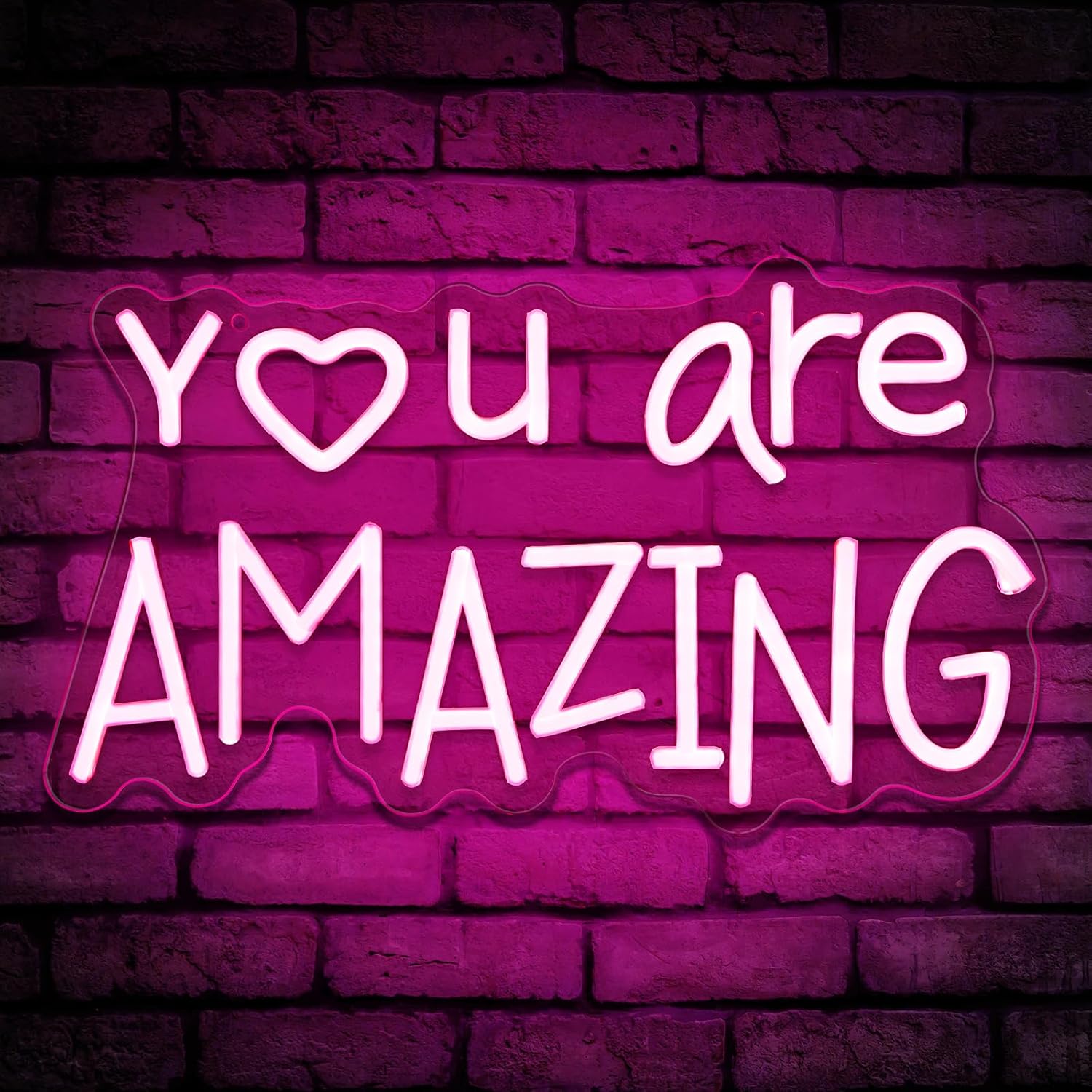 - funny Neon Sign: you are amazing LED neon light sign gives you or your family or friends the inspiring and warming power; The package includes 1 pink you are amazing neon sign, 2 hooks, and 1 metal chain, each light is about 15 x 8.6 inches, powered by a 78.7 inches USB cable, and with an independent switch; Our lights also support stepless dimming
