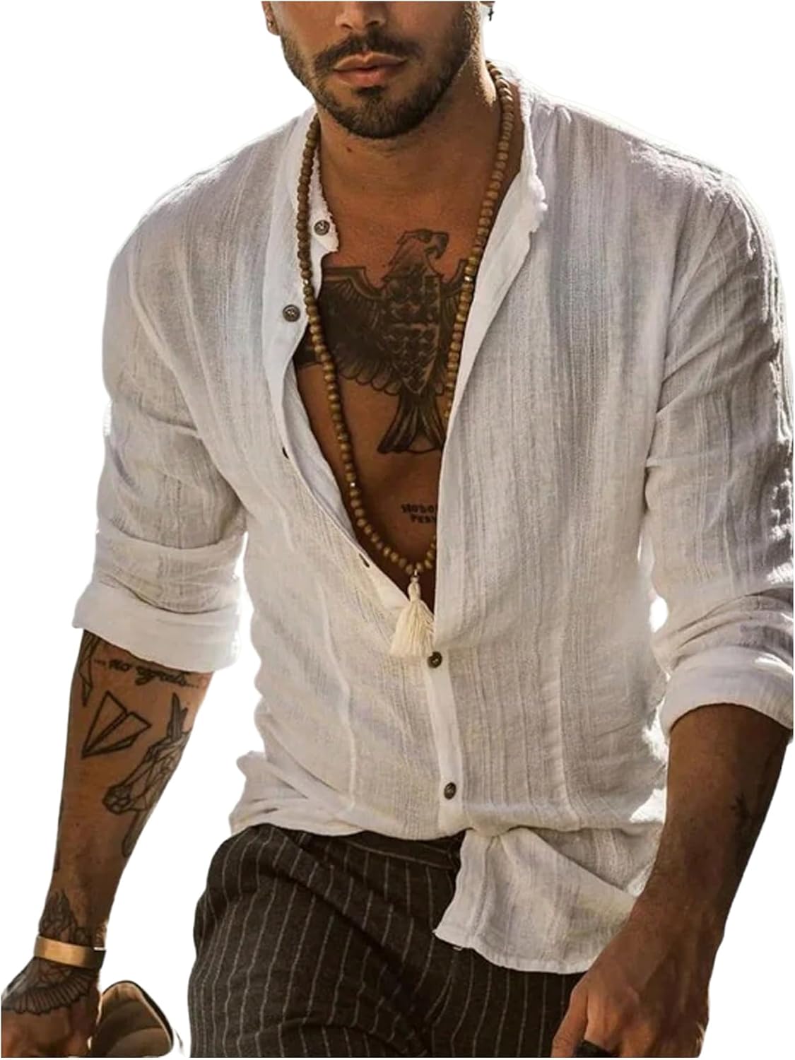 GORGLITTER Men's Linen Button Down Shirt Long Sleeve Textured Henley Collared Boho Vacation Tops