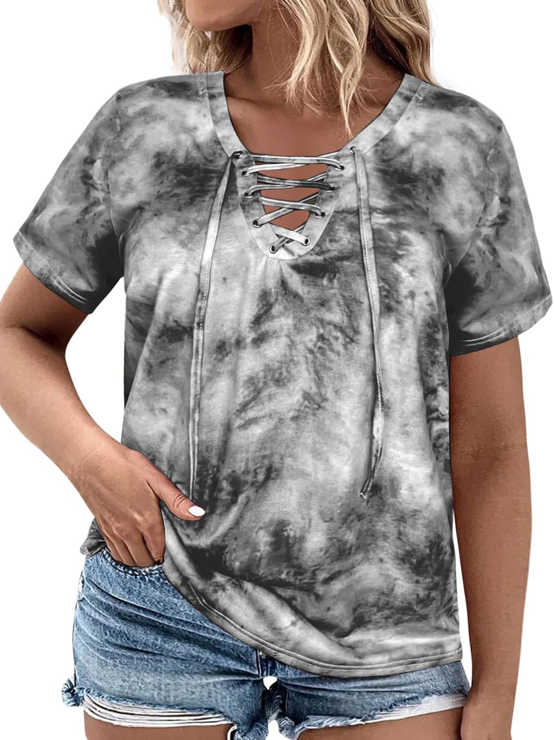 VISLILY Womens-Plus-Size-Summer-Tops Casual Lace Up Front T Shirts Tie Dye V Neck Tees Trendy Short Sleeve Tunics XL-5XL