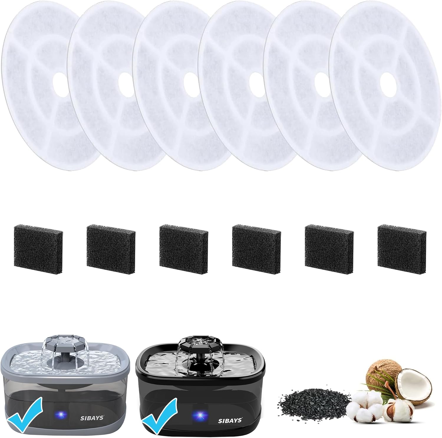 SIBAYS 6 Pack 7" Large Cat Water Fountain Filters Replacement for 2.5Gal/9.5L Dog Water Fountain(FS68) with 4 Layers Filtration System, Made of Coconut Shell Activated Carbon and PP Cotton(Model: L03)