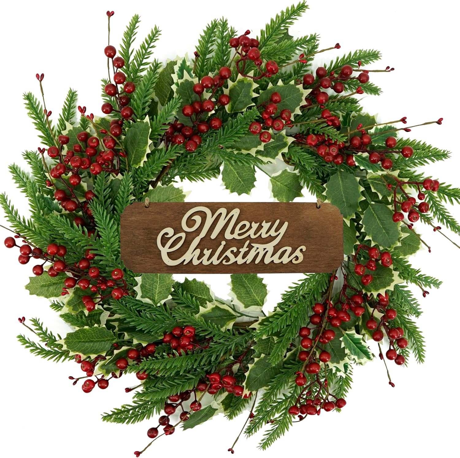 - Unique Design : This Christmas wreath is made of silk which can be used all year round.This Winter front door wreath is decorated with a full circle of christmas red berry,holly leaf, pine needle, pip berry,merry christmas sign make the wreath more nature and alive.especially the fake red berry,make the wreath in feeling of christmas and nature.
