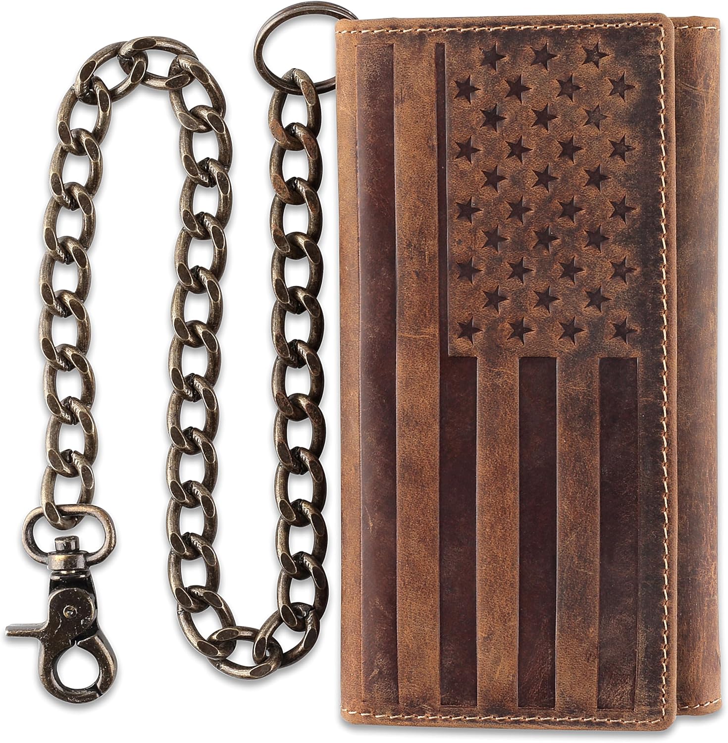F&L CLASSIC RFID Blocking Mens Tri-fold Long Style Cowhide Leather Steel Chain Wallet,brown flag,212-100