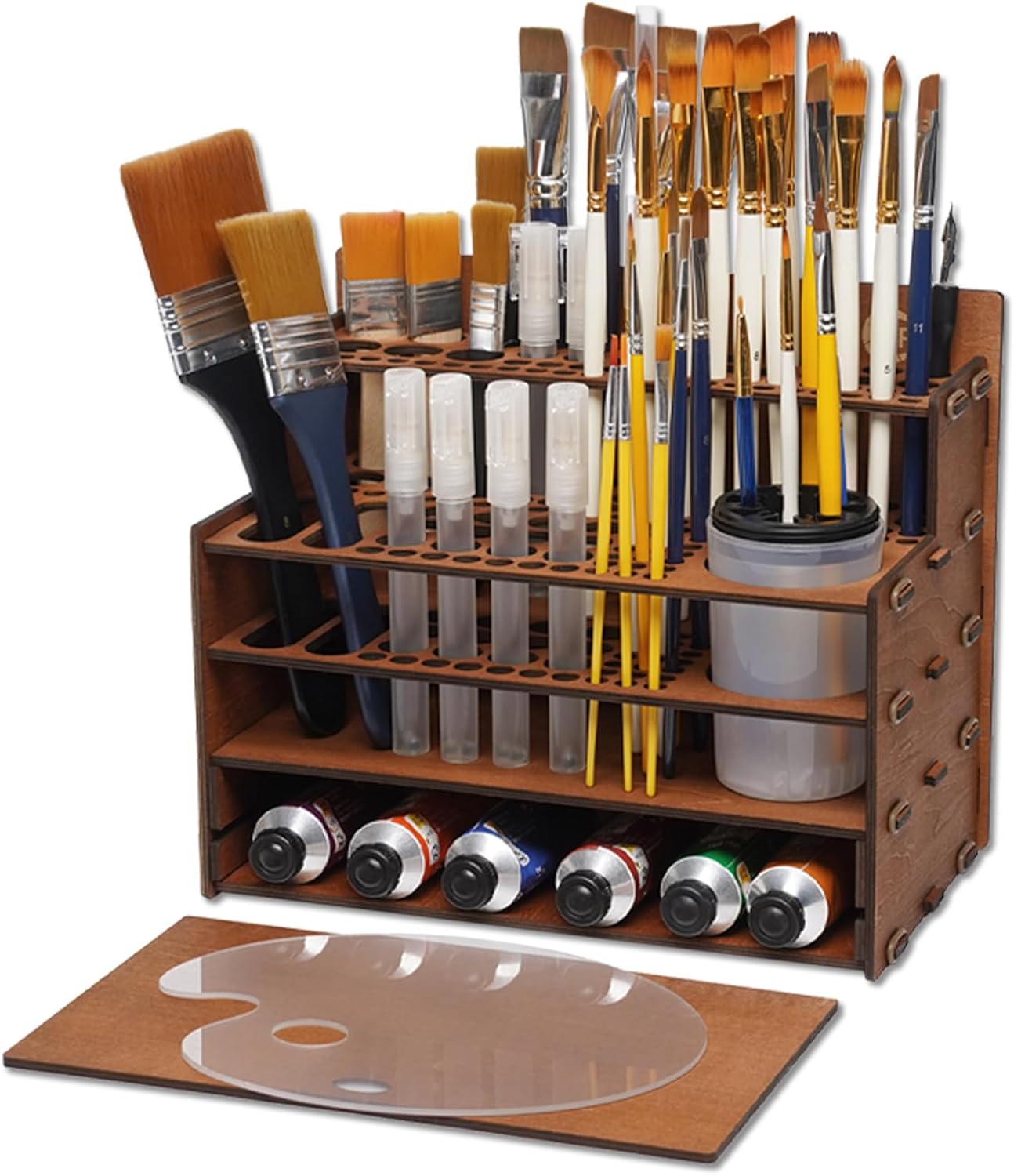 OPHIR Paint Brush Holder, 101 Holes Wooden Paint Brush Organizer with A Mini Acrylic Painting Palette & Cleaner Cup for Painting Brushes, Markers, Colored Pencils Organizer
