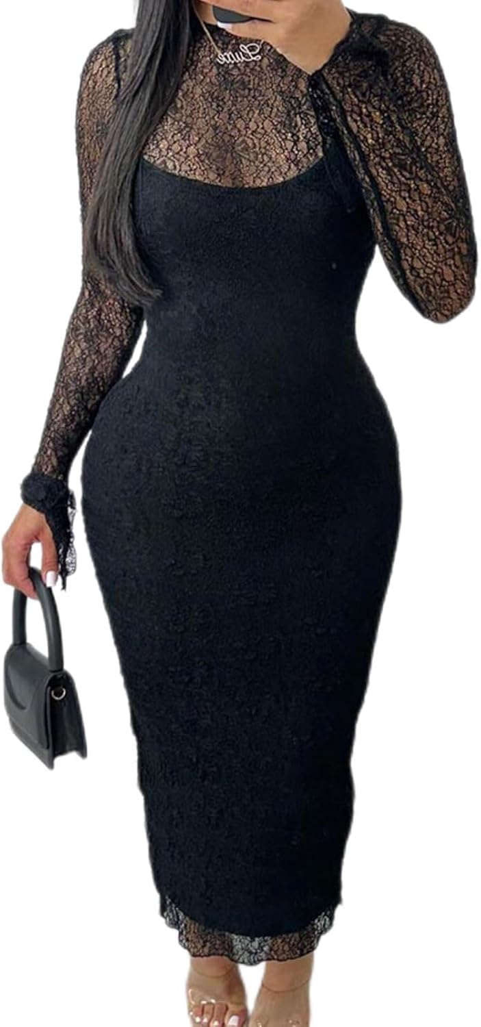 Sexy Lace Dresses for Women Long Sleeve Midi Dress Elegant Bodycon Cocktail Dresses Club Date Night Outfit