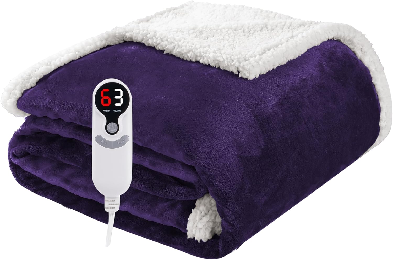 Electric Heated Blanket Throw Size 50"x60", Soft Flannel with Overheat Protection, 9 Adjustable Heat Settings & 10-Hour Auto-Off Timer, Fast Heating for Winter Comfort, Dark Purple