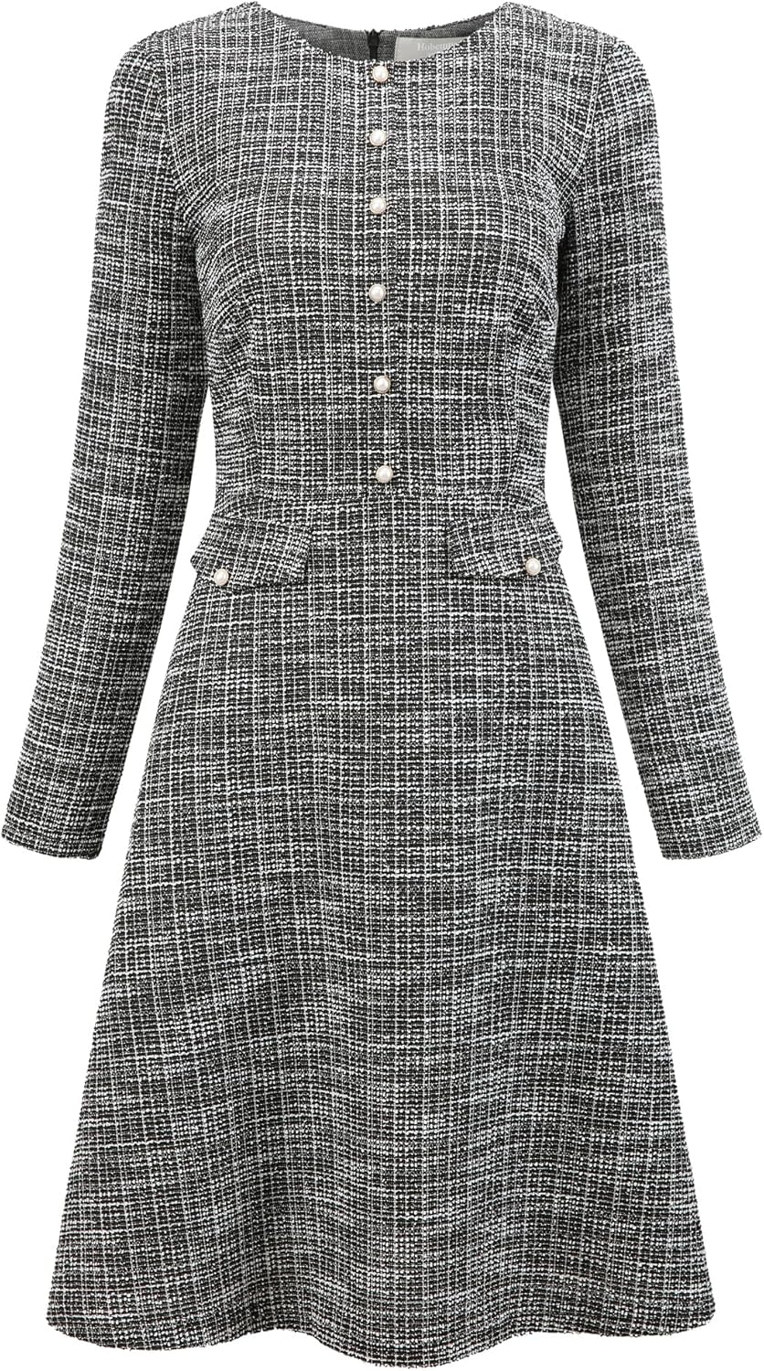 Women's Tweed Dress Long Sleeve Elegant Business Work A-Line Dresses