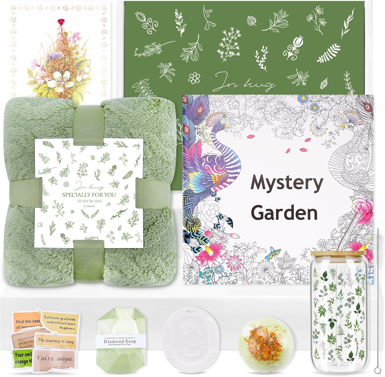 - [Complete 10-Piece Spa Set]: Includes a soft 59 × 43.3 inch blanket, 12oz floral glass cup with straw, coloring book, inspirational stickers, dried flower card, green tea gold leaf soap, rosemary, diffuser stone, and gift box; a soothing and practical gift package for women