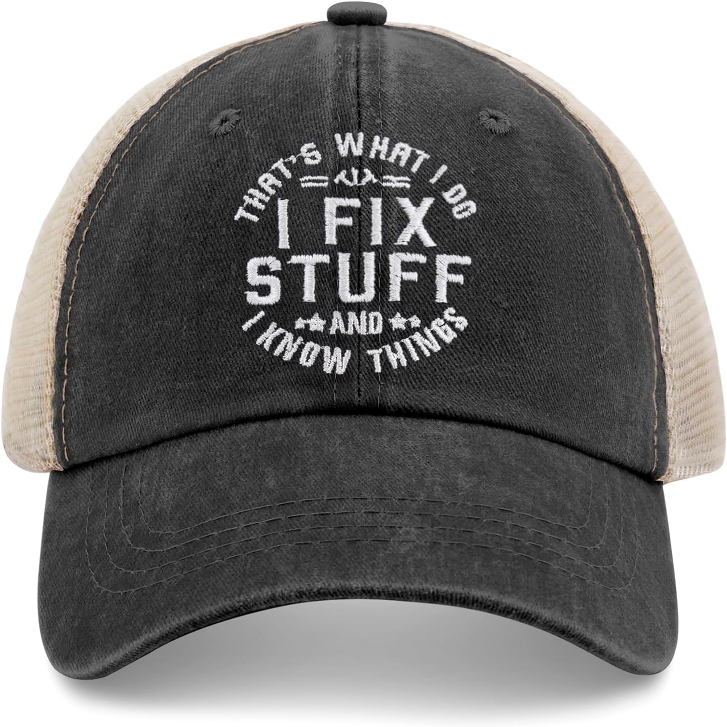 Embroidered That's What I Do I Fix Stuff & I Know Things Vintage Cotton Washed Soft Mesh Baseball Hat