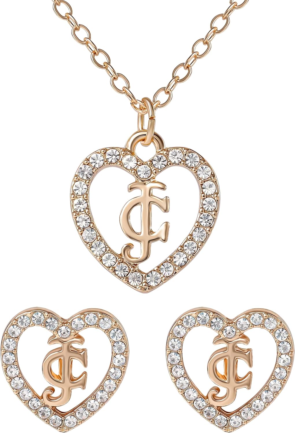 Juicy Couture Clear Stones Logo Heart Necklace 18+2" and Heart Stud Earrings for Women, Valentines Day Gifts for Her