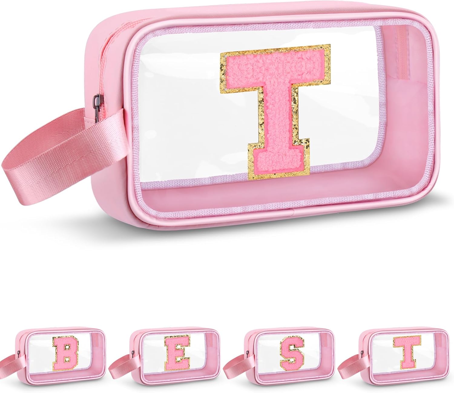 Initial Makeup Bag,Letter T Cute Clear Monogrammed Cosmetic Travel Bag for Womens Girls,Personalized Pink Aesthetic Traveling Make Up Organizer Bag for Beach,Waterproof Toiletry Bag