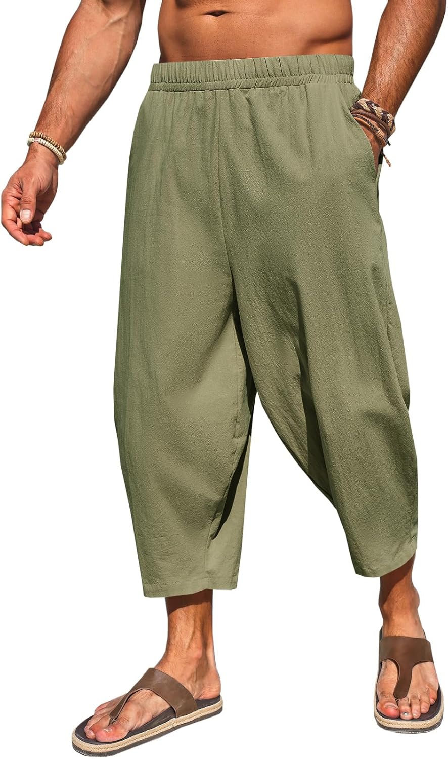 Runcati Mens Cotton Harem Capri Pants Yoga Beach Baggy 3/4 Shorts Pants Casual Elastic Waist Hippie Boho Pants