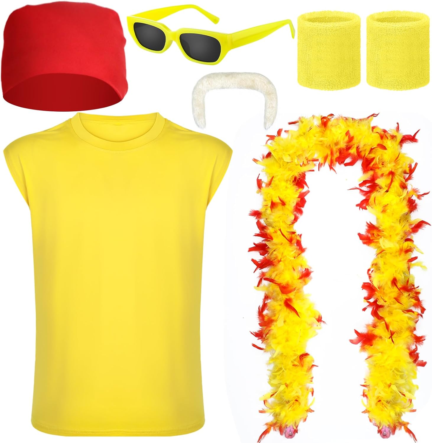 6 Pcs Halloween Wrestler Costume Set Include Yellow Sleeveless T-shirt 6ft Feather Boa Mustache