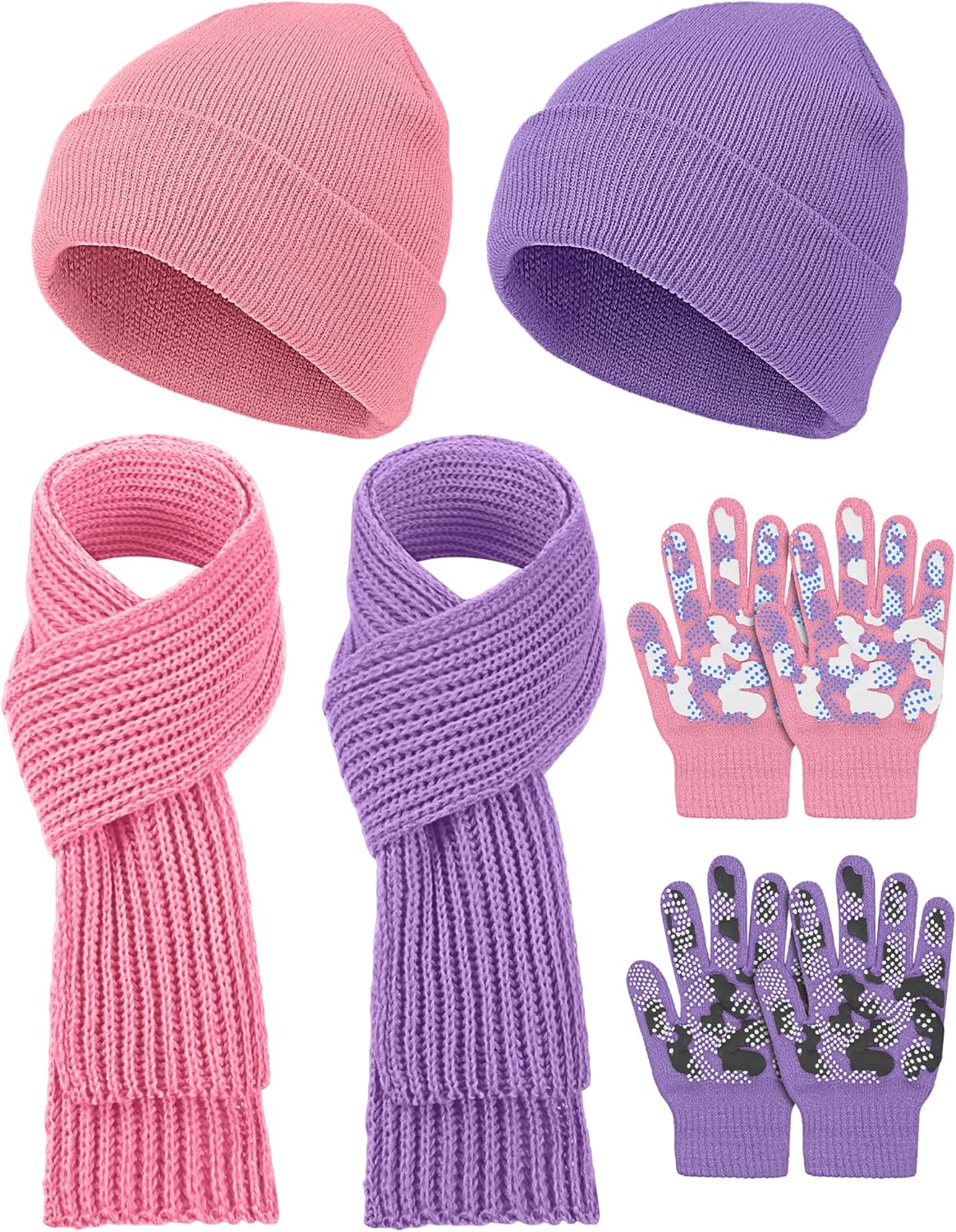 Suhine 6 Pcs Kids Beanies Scarves Gloves Winter Set Gloves Knitted Scarves Wrap Winter Beanie Hat for Boys Girls 5-12