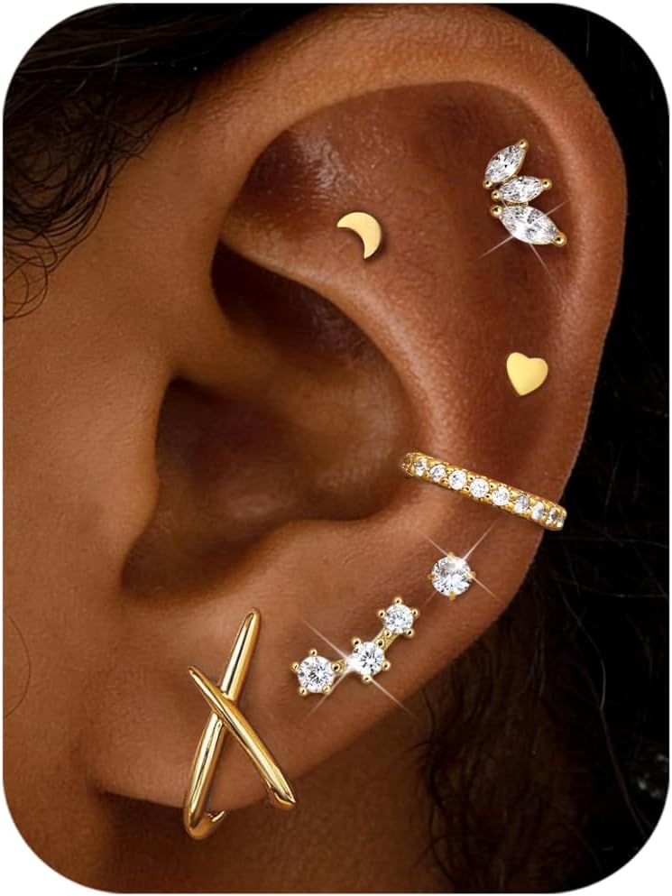 Tungary 7 Pairs 14K Gold Plated Surgical Stainless Steel Earrings Set for Multiple Piercings - Hypoallergenic Cartilage Stacking Studs with Butterfly Backs, Dainty Minimalist Jewelry Gift for Women