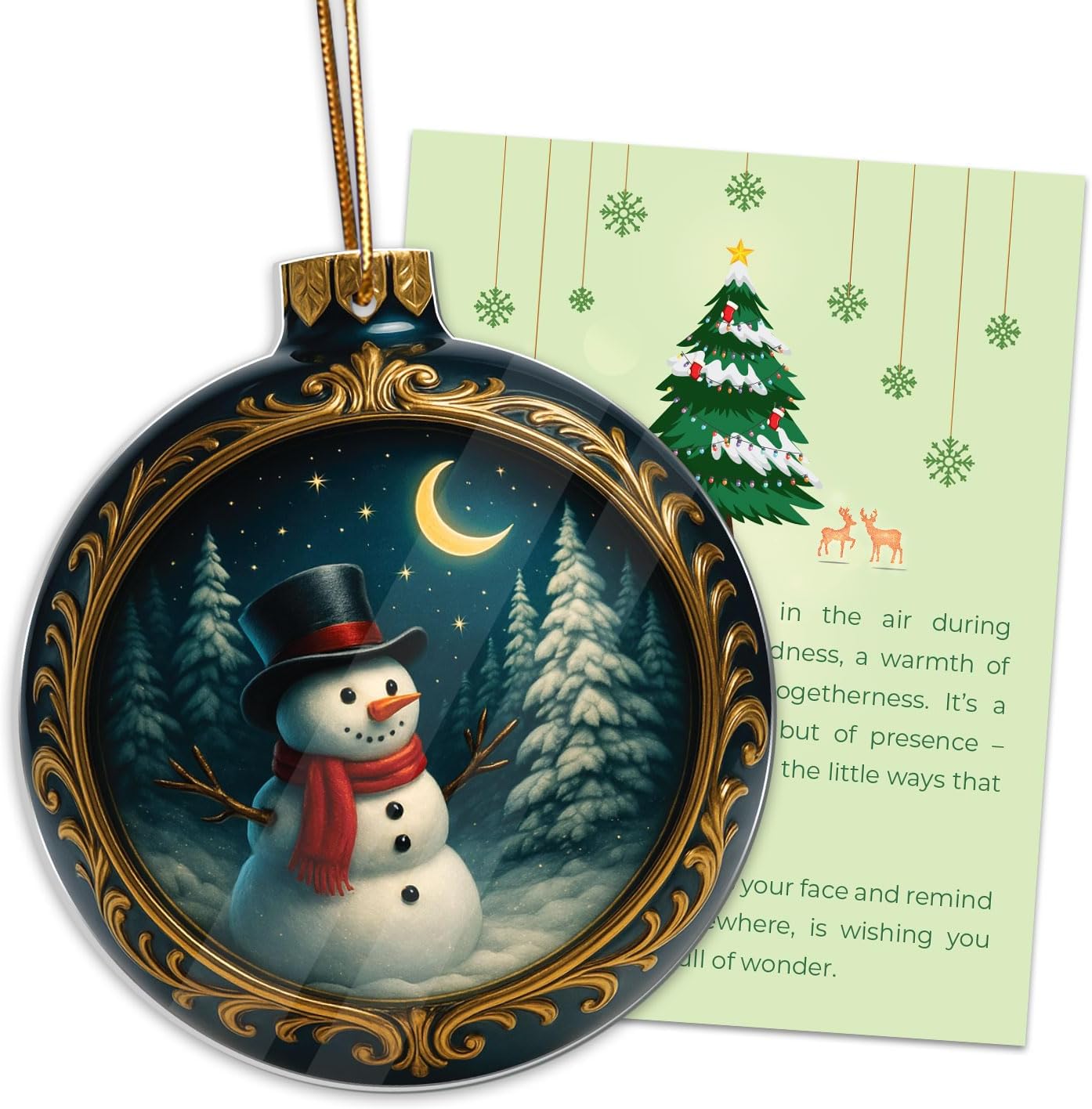 - ☃️ CLASSIC SNOWMAN DESIGN – Featuring a cheerful snowman under the moonlit forest, this ornament captures the heartwarming spirit of Christmas night.