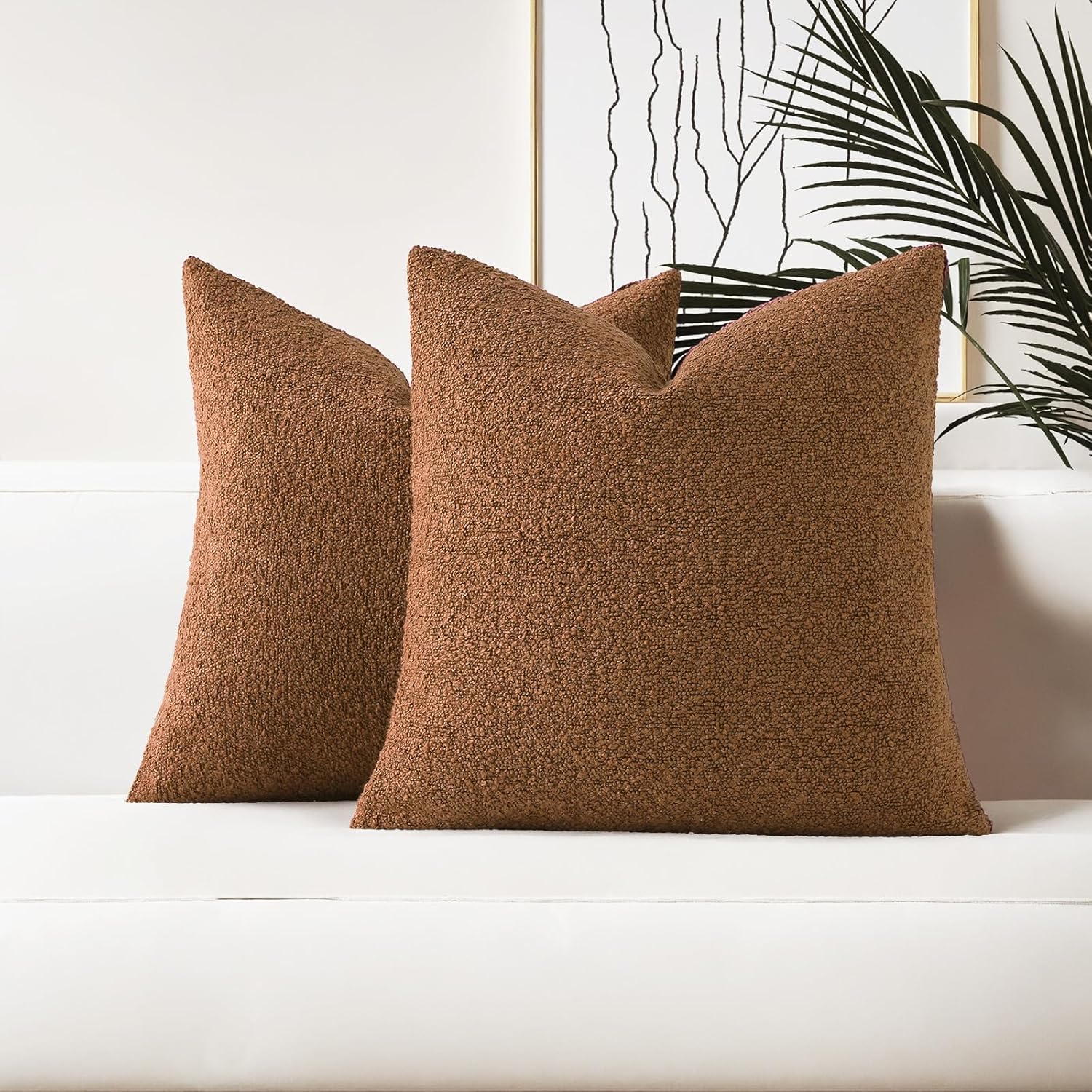 HAUSSY Set of 2 18x18 Decorative Throw Pillow Covers, Soft Cozy Textured Boucle Couch Cases, Home Decor for Couch Bed Living Room, Tobacco