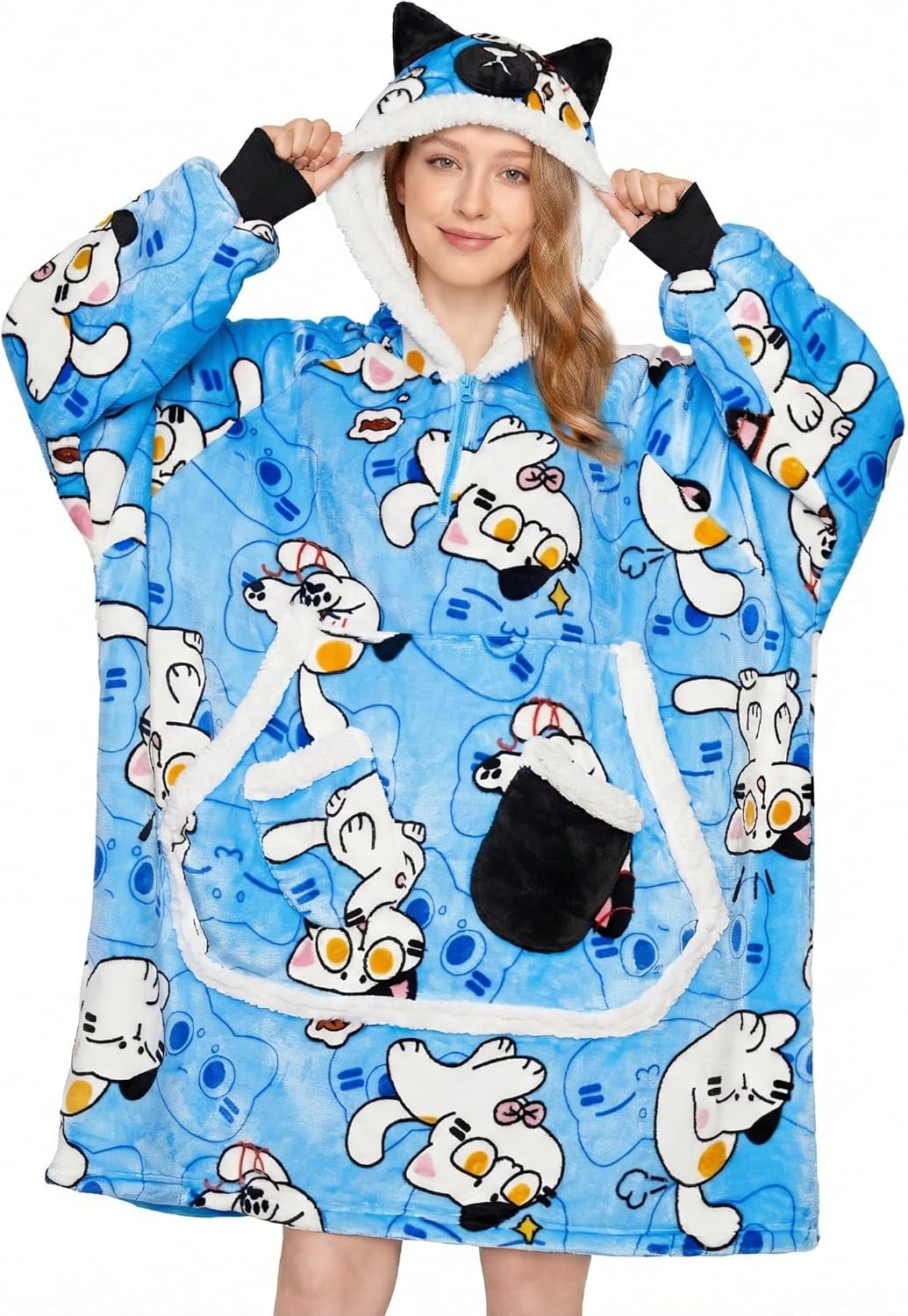 OLAOLA Cat Wearable Blanket Hoodie Snuggies for Adults Oversized Animal Heated Hooded Blanket Throw Comfy Sweatshirt Blanket Hoodie Women Men Sherpa Fleece Snuggy with Pockets & Sleeves for Christmas