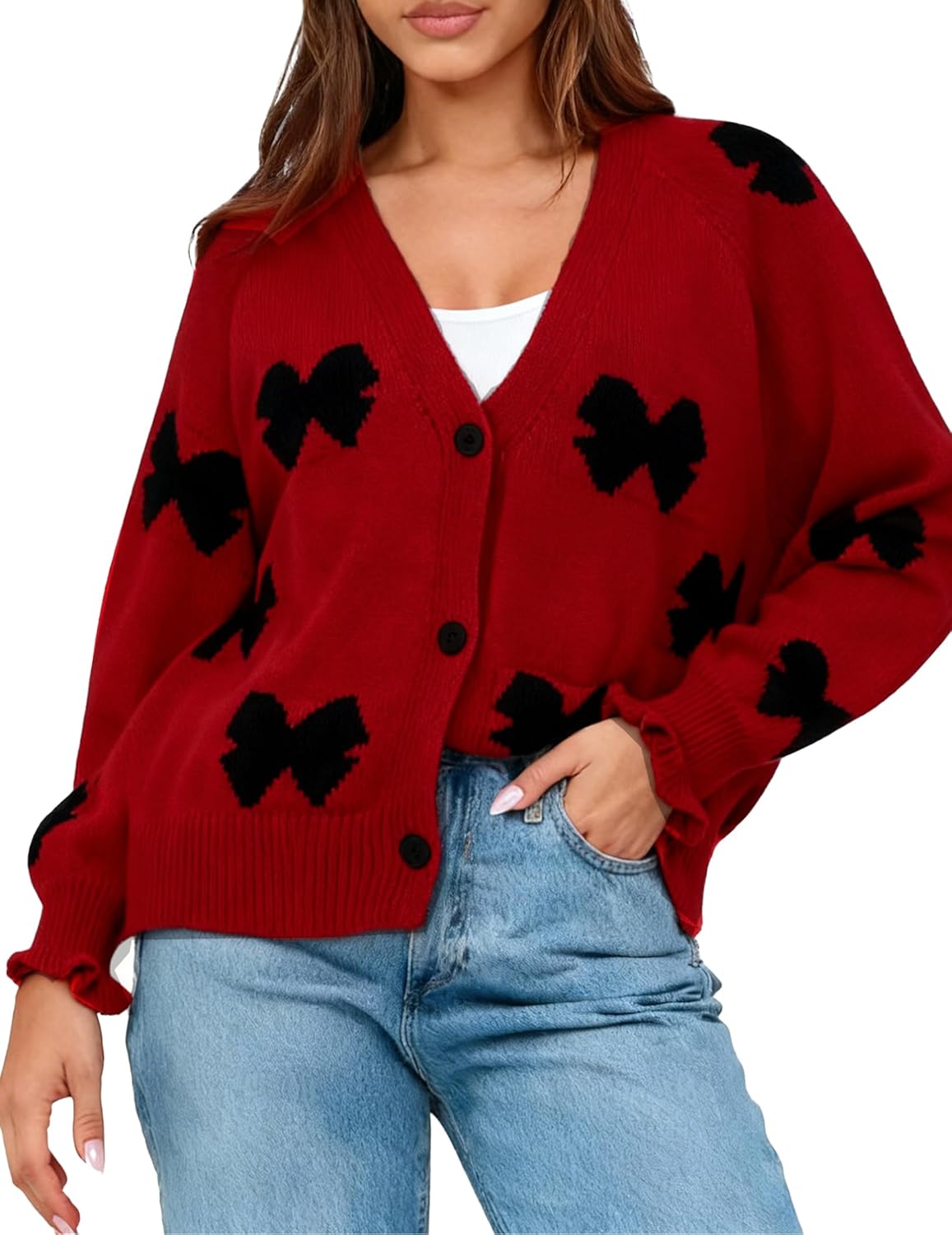 V Neck Sweaters for Women Trendy Bow Y2K Open Front Button Down Knit Sweater Cute Fall Ladies Sweaters Maroon Large