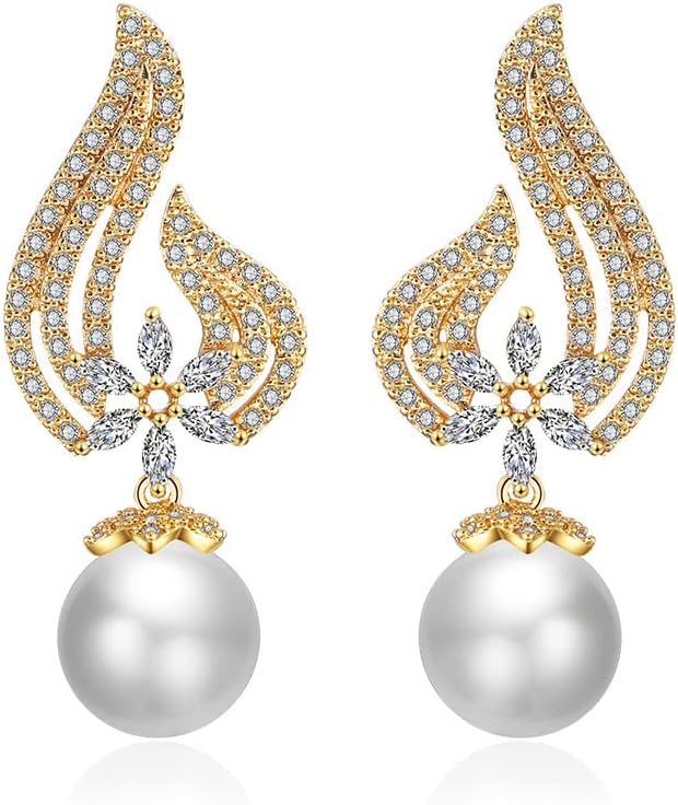 14K Gold Natural Crystal & Freshwater Pearl Drop Earrings for Women, Dainty Flower Design, White Pearl Dangle Earrings, Beautiful Christmas Jewelry Gift, Day to Evening Accessory