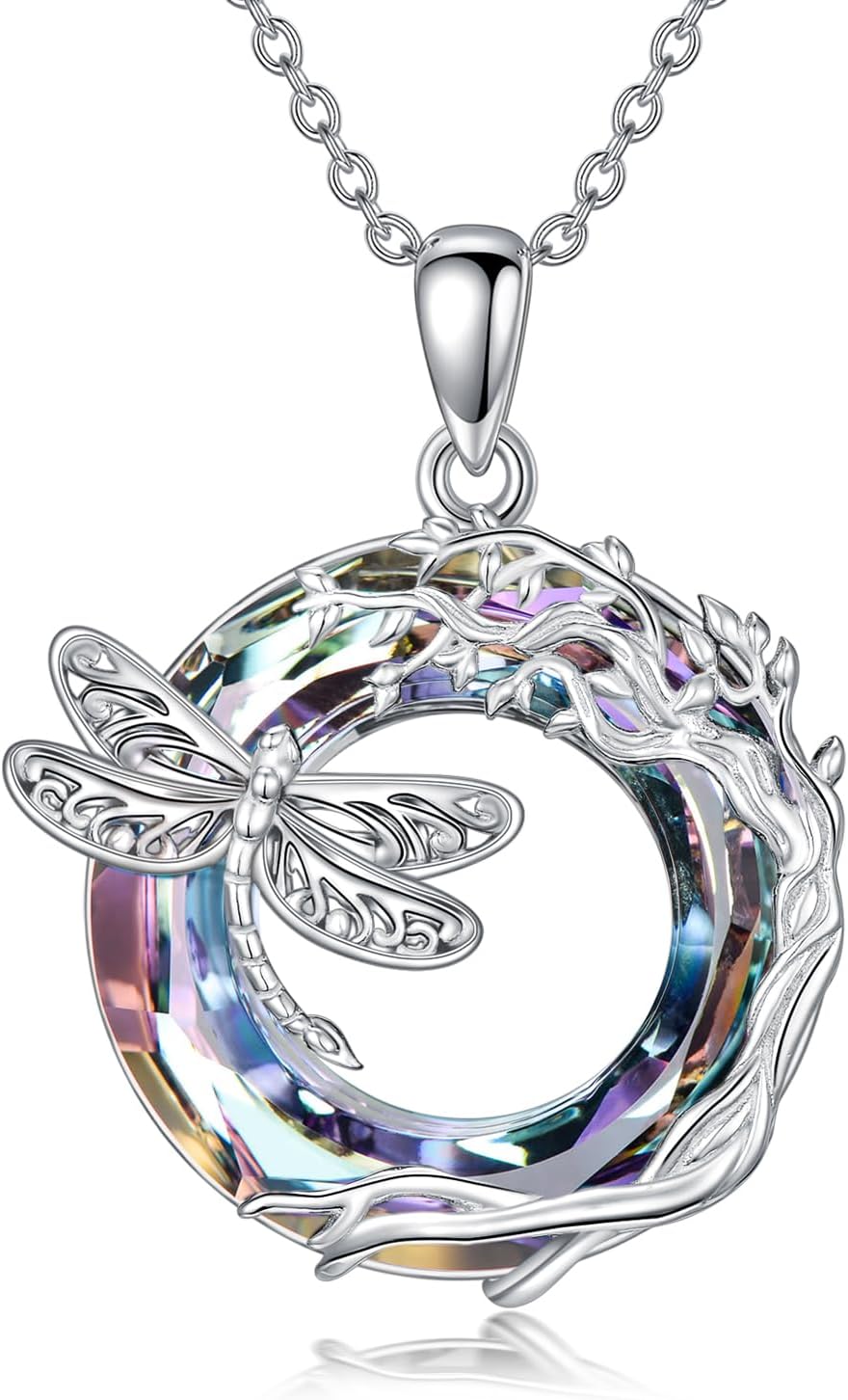 Dragonfly Necklace 925 Sterling Silver Dragonfly/Sunflower Bee Pendant Necklace Dragonfly with Blue Circle Crystal Dragonfly Jewelry Gifts as Holiday Christmas Gifts for Women