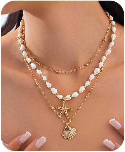 Seashell Charm Necklace for Women Stackable Starfish Necklace Fashion Boho Adjustable Necklace Dainty Layered Pendant Conch Shell Summer Beads Beach Vacation Essentials Ocean Jewelry Gifts